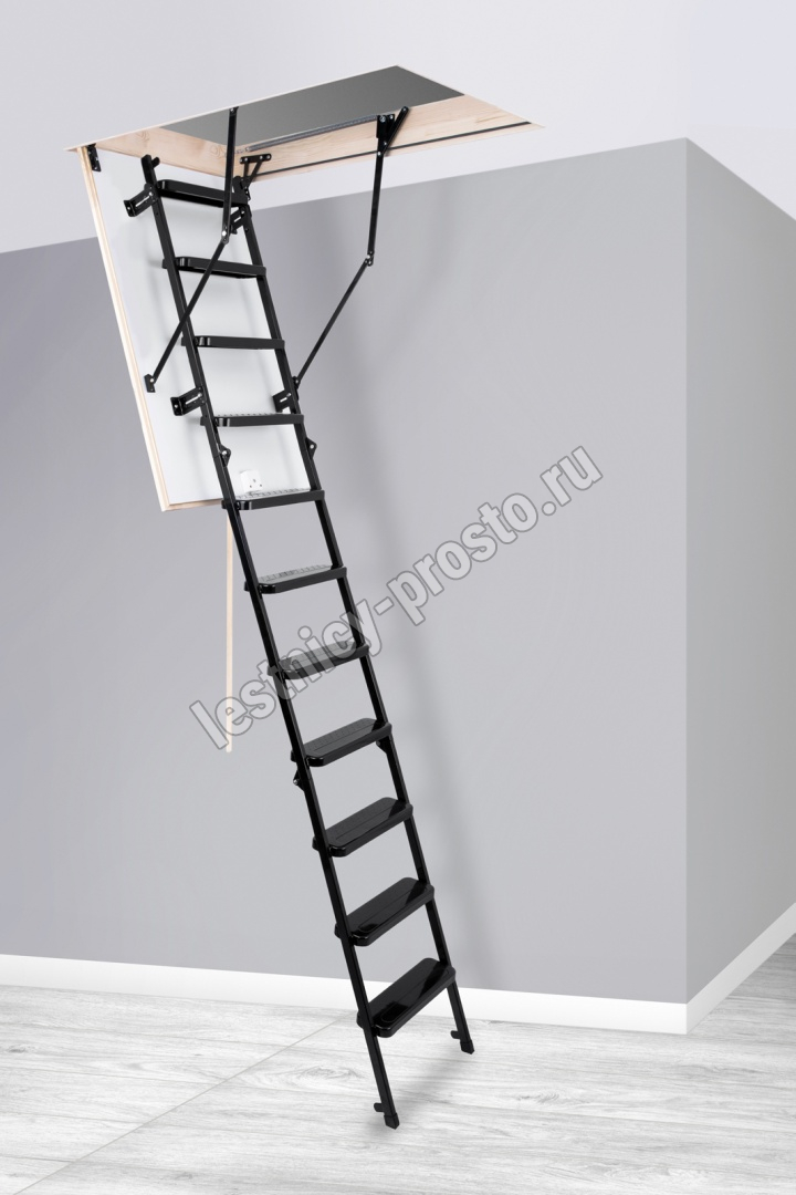 Лестница складная трехсекционная. Рабочая поверхность полностью выполнена из металла и покрашена порошковой краской. Термоизоляционная крышка типа "сэндвич", толщиной 30 мм, утеплена пенопластом, облицована с двух сторон ДCП белого цвета.