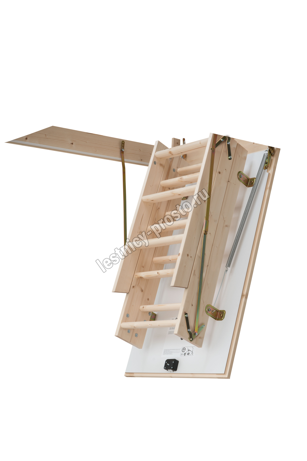 В комплекте: люк из сэндвич-панели, пружинный механизм "короб-люк", короб, трехсекционная лестница с сосновыми ступенями, замок люка, штанга для раскладывания лестницы.