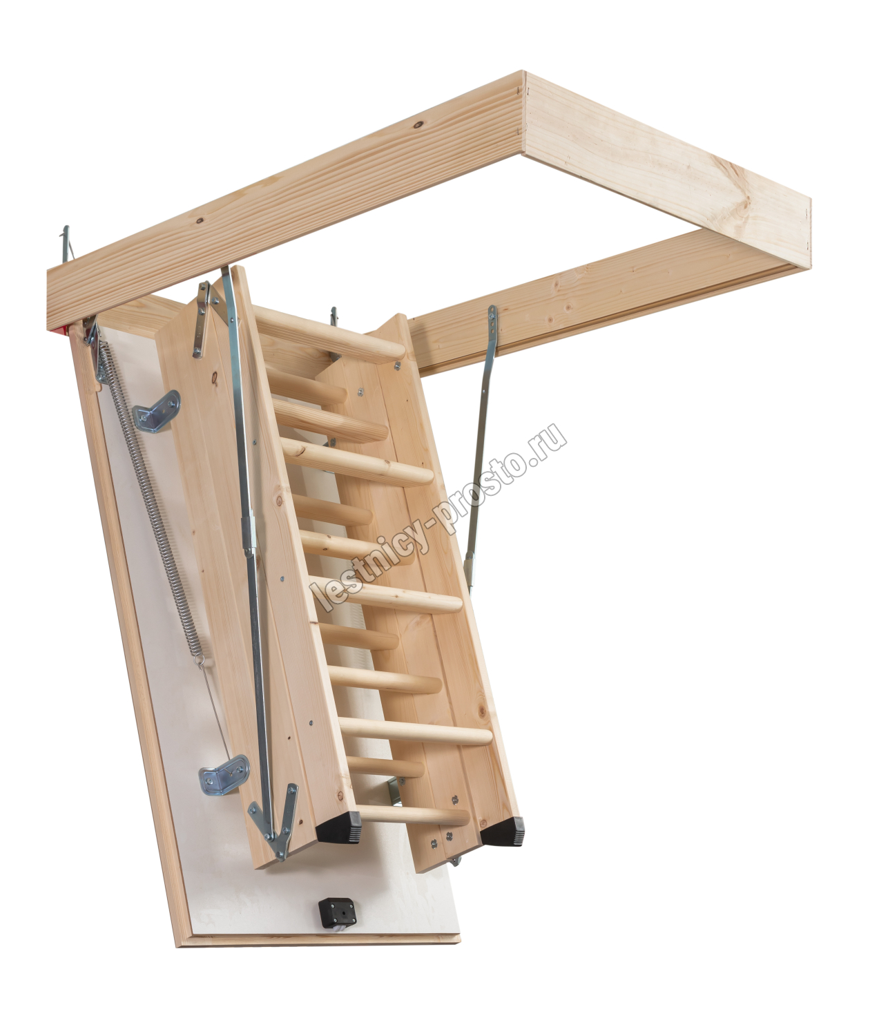 В изготовлении лестницы используется дерево хвойных пород. Лестница оснащена утепленным двусторонним белым люком, который практически не заметен на потолке. В случае необходимости крышку люка можно перекрасить в любой другой, подходящий для интерьера цвет.