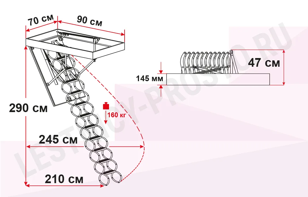 Все элементы лестницы выполнены из экологически чистых материалов и обработаны веществами, не содержащими тяжелых металлов. На ступенях антискользящие насечки. Короб лестницы изготовлен из металла. Термоизоляционная крышка типа "сэндвич" утеплена пенопластом, облицована с двух сторон ДСП белого цвета. Короб люка с уплотнителем. В комплекте деревянный стержень для открывания лестницы.