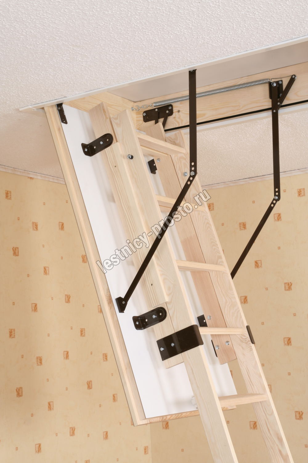 Лестница раздвижная двухсекционная, изготовлена из сосны. Термоизоляционная крышка типа "сэндвич" имеет усиленную теплозащиту, облицована с двух сторон ДСП белого цвета. По контуру короба имеется уплотнитель. Все металлические элементы лестницы покрыты порошковой краской, ступени лестницы имеют антискользящие насечки и закреплены в столярное соединение «ласточкин хвост», что позволяет выдерживать нагрузку 150 кг. При раскладывании лестницы нет вылета за пределы короба, что позволяет использовать эту модель лестницы в таких помещениях, где невозможно использовать чердачные лестницы с большим разбегом открытия. Удобна для эксплуатации на большой высоте. Деревянный стержень для открывания лестницы в комплекте..