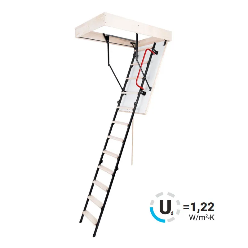 Удобная поворотная лестница на второй этаж. Дополнительные ограждения по первому маршу обеспечивают безопасность при подъеме и спуске, кроме того, небольшой угол подъема открывает всю площадь ступеней. Монтаж осуществляется силами двух человек на объекте по указаниям, приведенным в паспорте на лестницу.