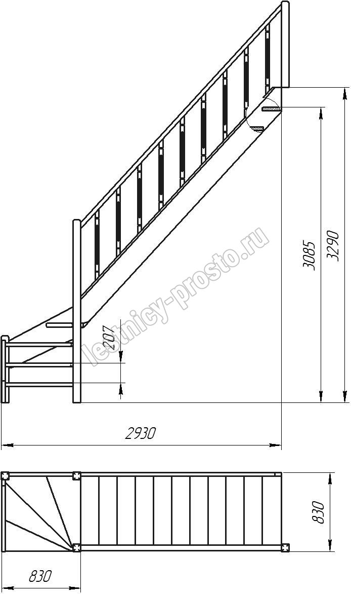 Деревянная межэтажная лестница ЛЕС-07 3085-3290 проем 2930-830, Лиственница