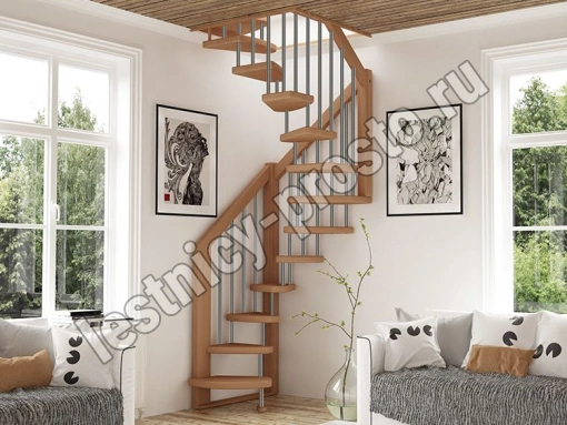 Базовый комплект включает в себя деревянные элементы лестницы и ограждения без какого-либо покрытия. Стильная сверхмалогабаритная лесенка, она выручит в таких помещениях, где установка других лестниц проблематична из-за нехватки пространства.