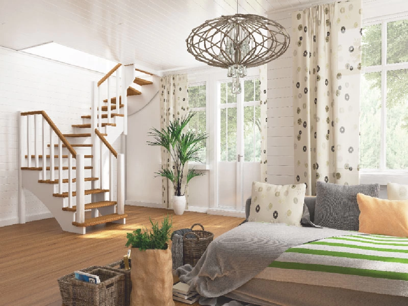 Ступени и поручень лестницы изготовлены из дуба, остальные элементы из сосны. Возможно изготовление модели полностью из дуба. Базовый комплект включает в себя деревянные элементы лестницы и ограждения без какого-либо покрытия. Вы можете заказать у нас покраску лестницы в цвета, отвечающие особенностям вашего помещения.