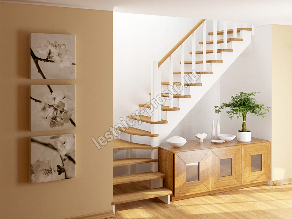 Ступени и поручень лестницы выполнены из дуба, остальные элементы из сосны. Возможно изготовление данной модели полностью из дуба. Базовый комплект включает в себя деревянные элементы лестницы и ограждения без какого-либо покрытия.