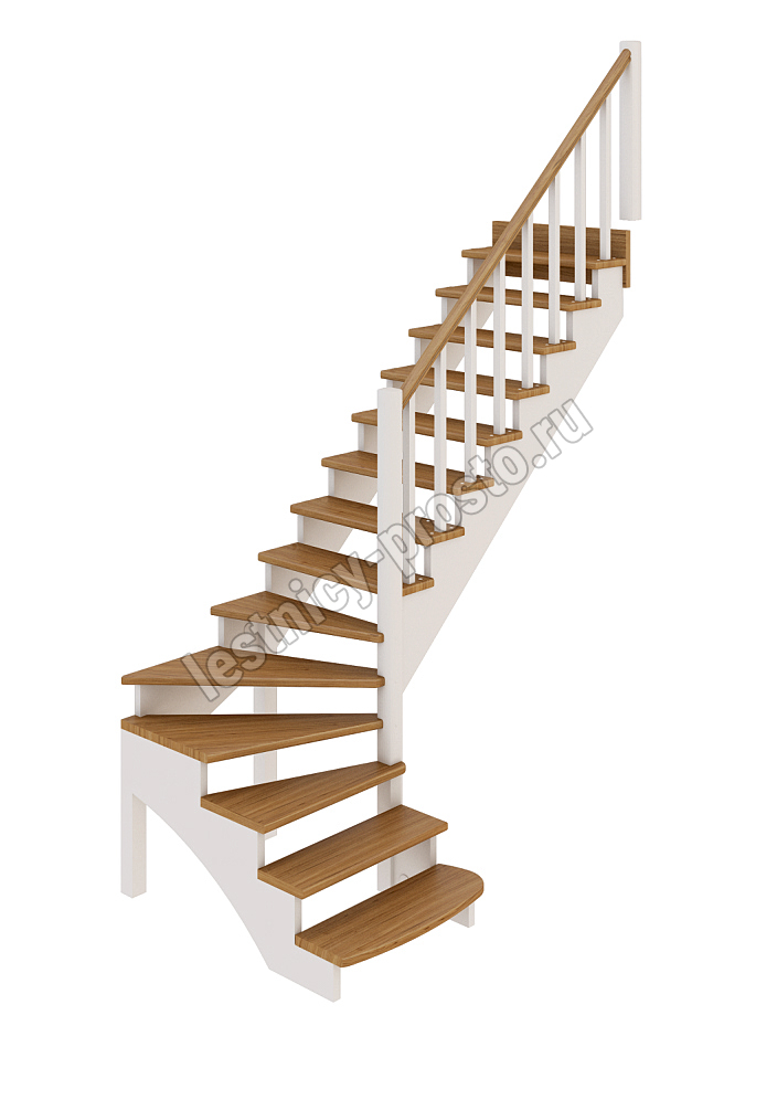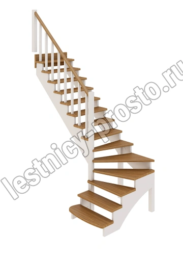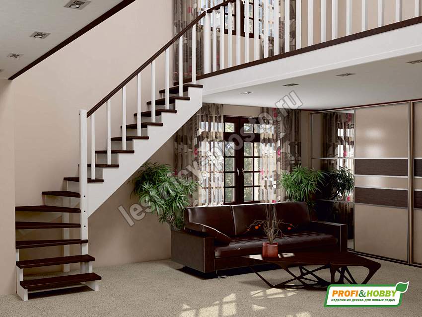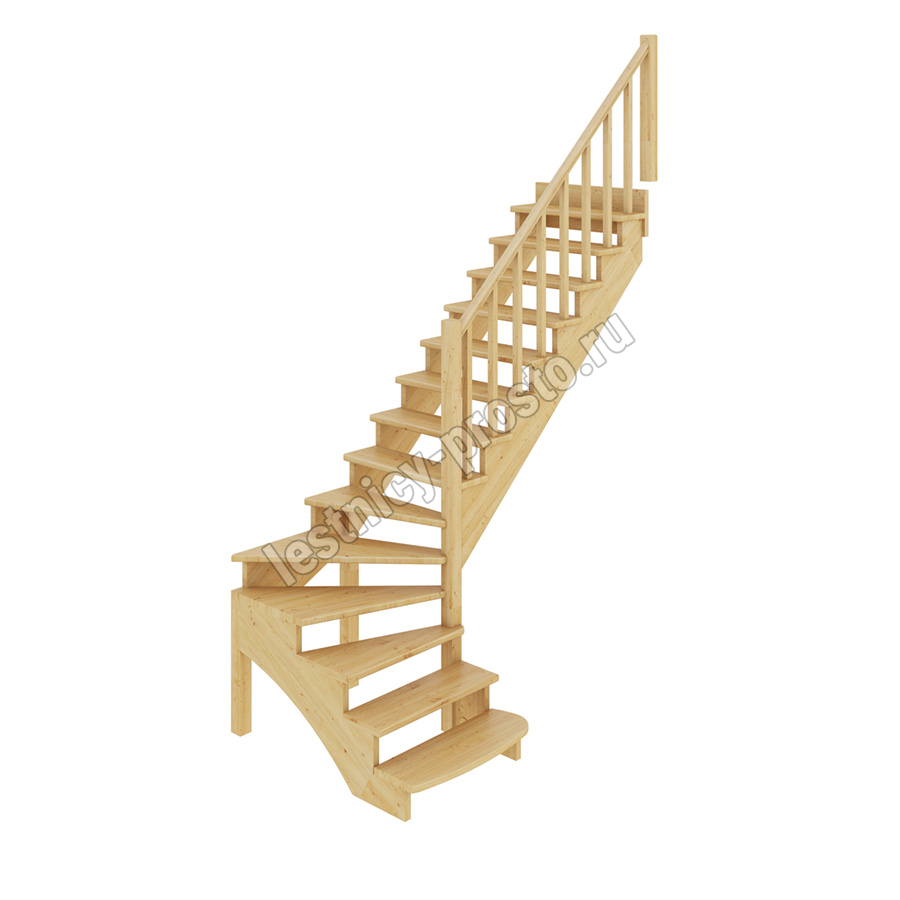 В производстве лестницы К-001м/1 под покраску используется сосна с небольшими изменениями цвета, что практически не влияет на ее механические свойства и почти незаметно при покраске в темные цвета. Базовый комплект включает в себя элементы лестницы и ограждения без какого-либо покрытия.