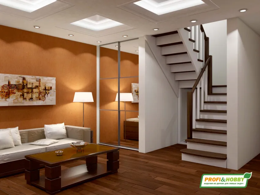 Базовый комплект включает в себя деревянные элементы лестницы с подступёнками и ограждения без какого-либо покрытия. Стандартное ограждение можно заменить любым на ваш вкус (стоимость может измениться).
