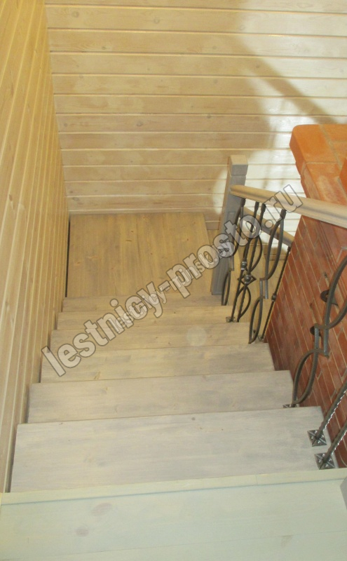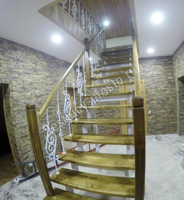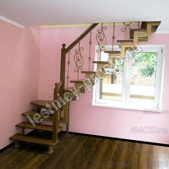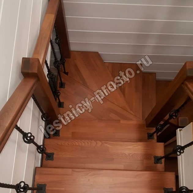 Кованые элементы и деревянные столбы можно выбрать по каталогу (после оформления заказа, мы вышлем вам фото образцов). Деревянные элементы: столбы и поручень по умолчанию идут без окрашивания, металлические элементы окрашены в цвет каркаса лестницы. Ограждение начинается со второй ступени.