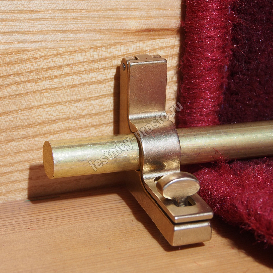 Ковродержатель комплектуется двумя держателями из латуни цвета золото, а также цельным прутком из латуни длиной от 131 до 170 см. Конструкция является сборно-разборной не требующей демонтажа креплений, что делает ее долговечной и очень удобной для чистки ковров и ковровых покрытий.