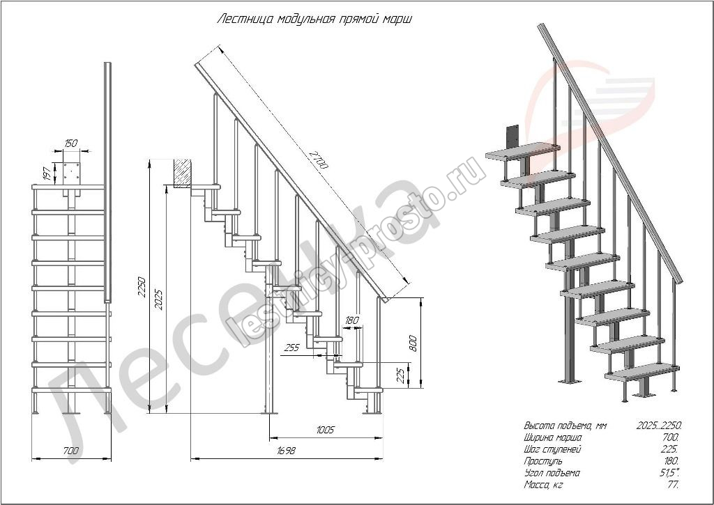 Высота лестницы 2025 - 2250 мм