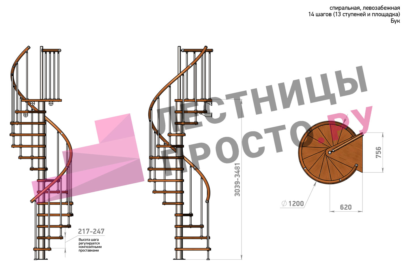 Высота лестницы 3039 - 3481 (13 ступеней) мм
