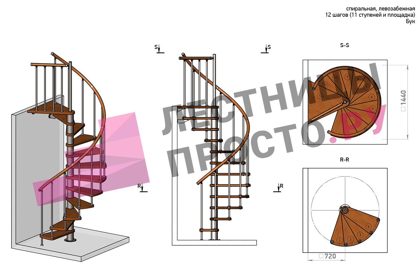 | Винтовая лестница Prosto Spiral White D140см, h325.7-369.8 см, бук |