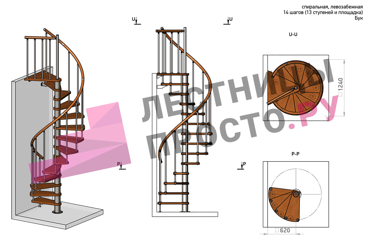 | Винтовая лестница Prosto Spiral White D140см, h303.9-348,1 см, бук |