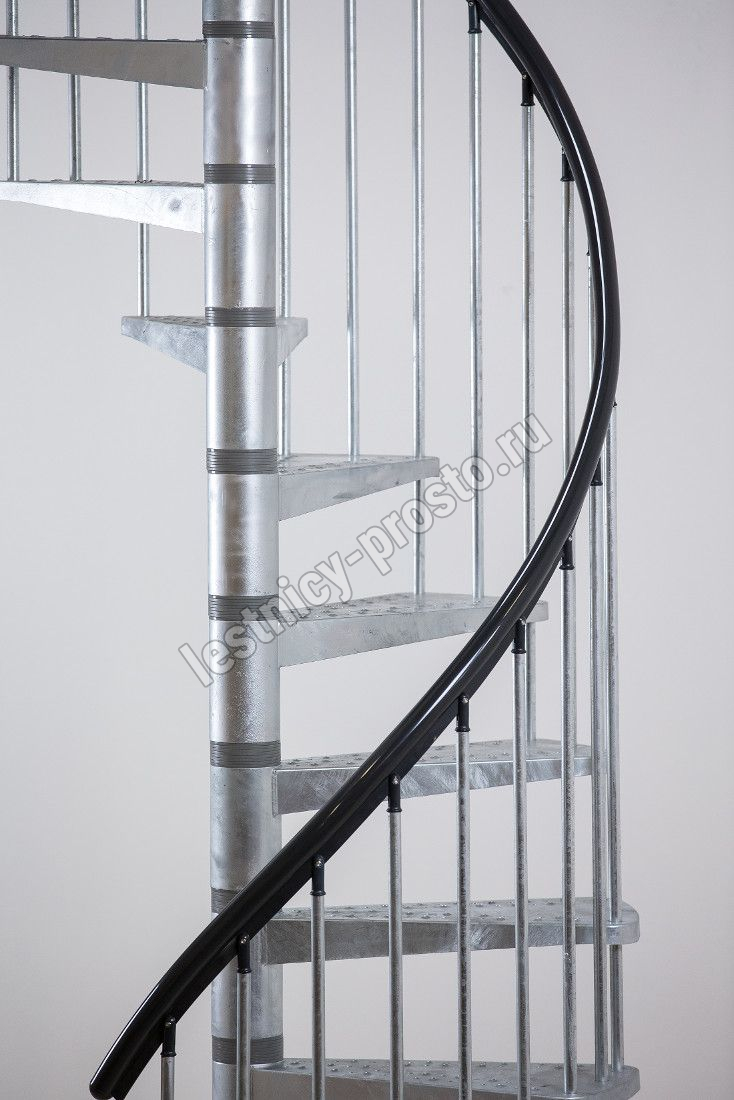 Металлическая винтовая лестница с металлическим поручнем и площадкой. Лестница монтируется как по часовой стрелке, так и против нее. Предназначена для использования внутри помещения или снаружи. На ступенях противоскользящие насечки. Лестница изготовлена из оцинкованной стали.