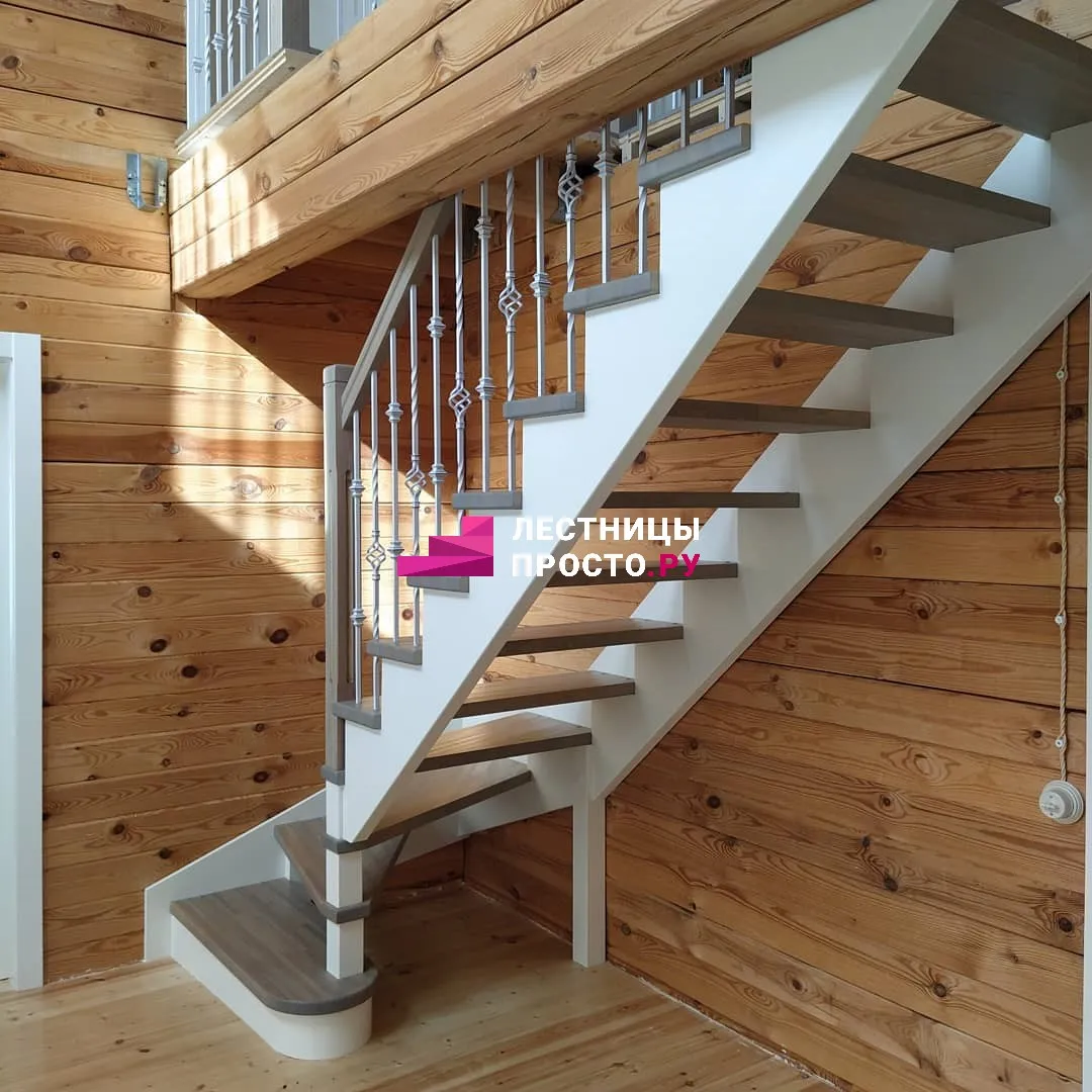Лестница из сосны с поворотом и подступёнками для частного дома